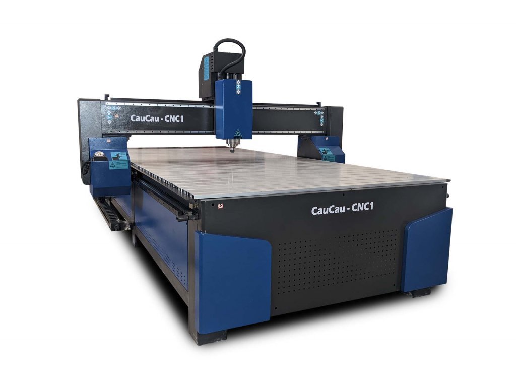 CAUCAU KOMPAS H3000BIG - 2D/3D CNC portálová frézka. Celostolová deska s T-drážkou. Obrobitelná plocha 1500x3000x200mm, rychlost 15m/min.