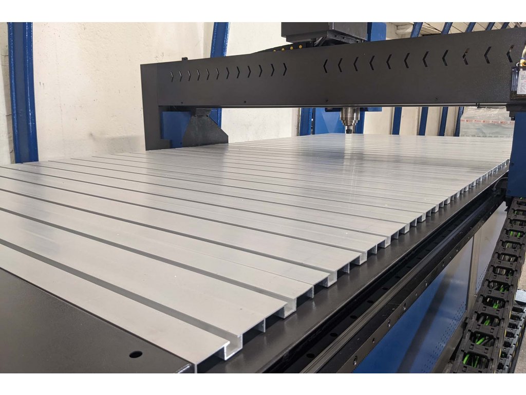 - Obráběcí plocha osazena plnorozměrovou hliníkovou deskou s T-drážkou.